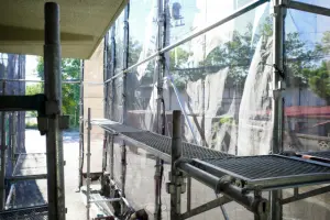 足場を組んで、塗料飛散防止ネットを張ります。その後、下地処理を行います。例えば、高圧洗浄やサビなどを落とすケレン作業がこれにあたります。下地処理を行い、密着性を高めたら、下塗り・中塗り・上塗りを行います。